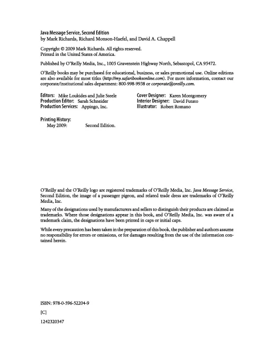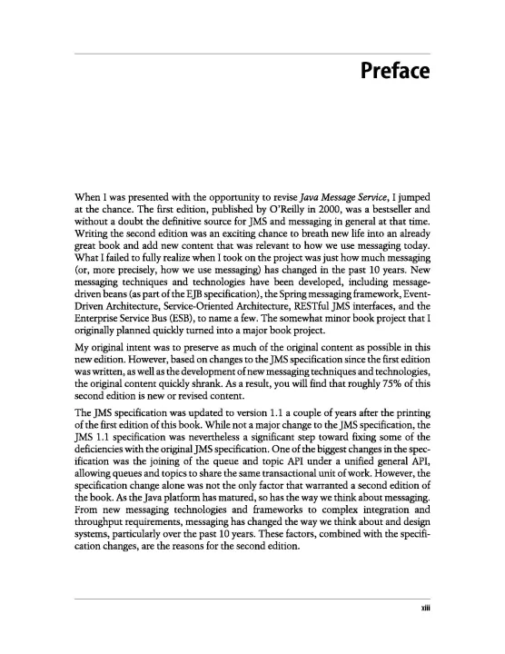 Java Message Service, Second Edition, is a thorough introduction to the standard API that supports "messaging" -- the software-to-software exchange of crucial data among network computers. You'll learn how JMS can help you solve many architectural challenges, such as integrating dissimilar systems and applications, increasing scalability, eliminating system bottlenecks, supporting concurrent processing, and promoting flexibility and agility. Updated for JMS 1.1, this second edition also explains how this vendor-agnostic specification will help you write messaging-based applications using IBM's MQ, Progress Software's SonicMQ, ActiveMQ, and many other proprietary messaging services. With Java Message Service, you will: