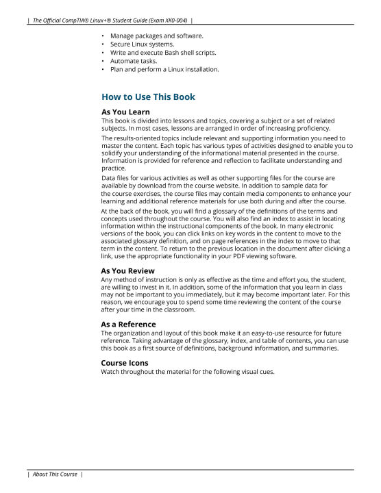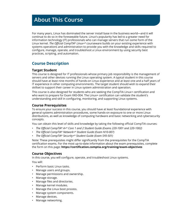 Linux is a UNIX-based operating system originally created by Linus Torvalds with the help of developers around the world. Developed under the GNU General Public License, the source code is free. Because of this Linux is viewed by many organizations and companies as an excellent, low-cost, secure alternative to expensive OSs, such as Microsoft Windows. The CompTIA Linux+ exam tests a candidate's understanding and familiarity with the Linux Kernel. As the Linux server market share continues to grow, so too does demand for qualified and certified Linux administrators.