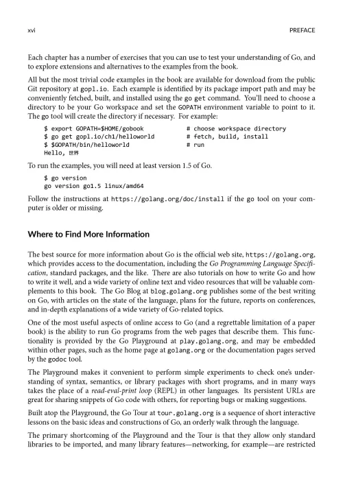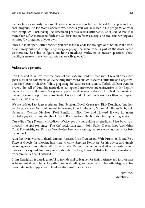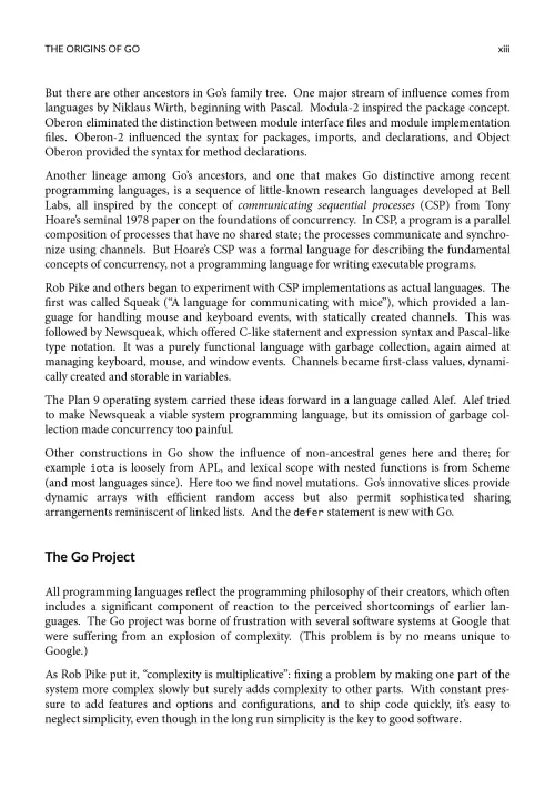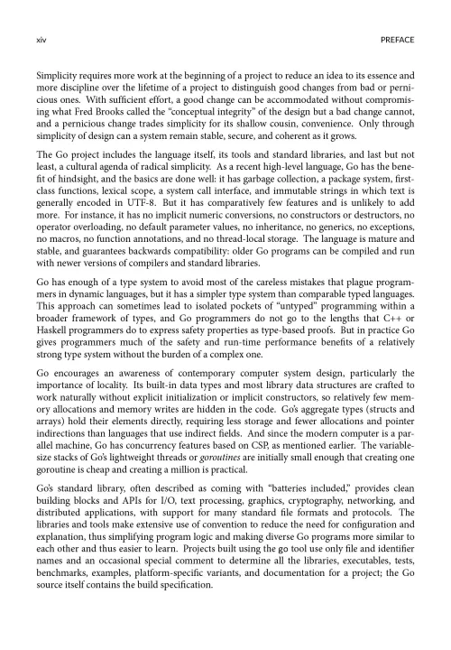 The first chapter is a tutorial on the basic concepts of Go, introduced through programs for file I/O and text processing, simple graphics, and web clients and servers.
